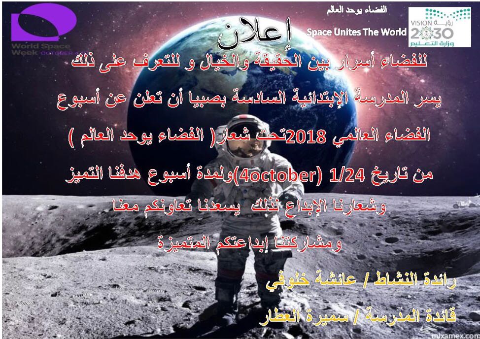 الابتدائية السادسة On Twitter إعلان تعليم صبيا تعلن الإبتدائية السادسة بصبيا عن تفعيل أسبوع الفضاء العالمي 2018 تحت شعار الفضاء يوحد العالم من تاريخ 1 24 ولمده أسبوع رائدة النشاط عائشه خلوفي قائدة المدرسة سميرة العطار